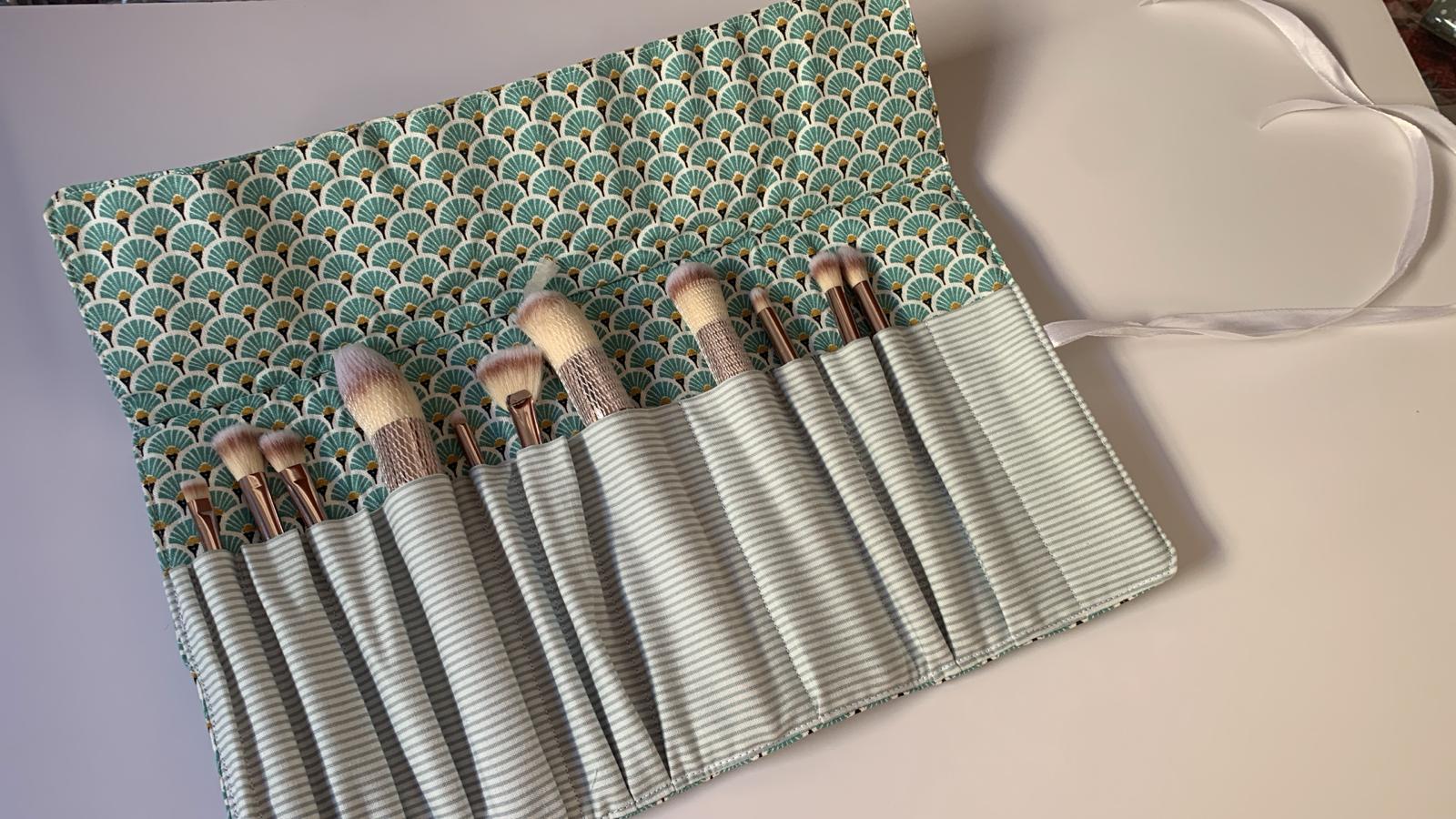 Precioso estuche para las brochas de tu maquillaje, con las brochas incluidas, en tejido estampado verde.