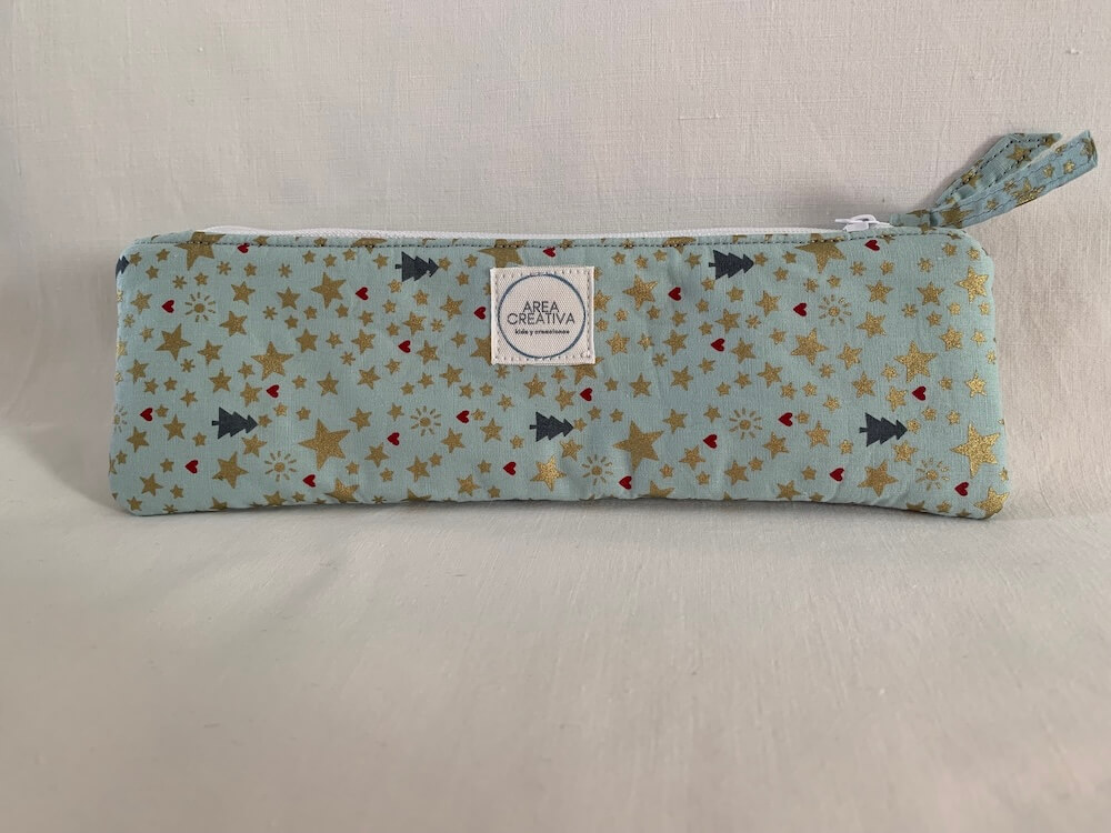 Esta pieza es perfecta para guardar lápiz y bolígrafo. Mide unos 23 cm de ancho y unos 8 cm de alto. Cierra con una cremallera superior que permite cerrar totalmente.