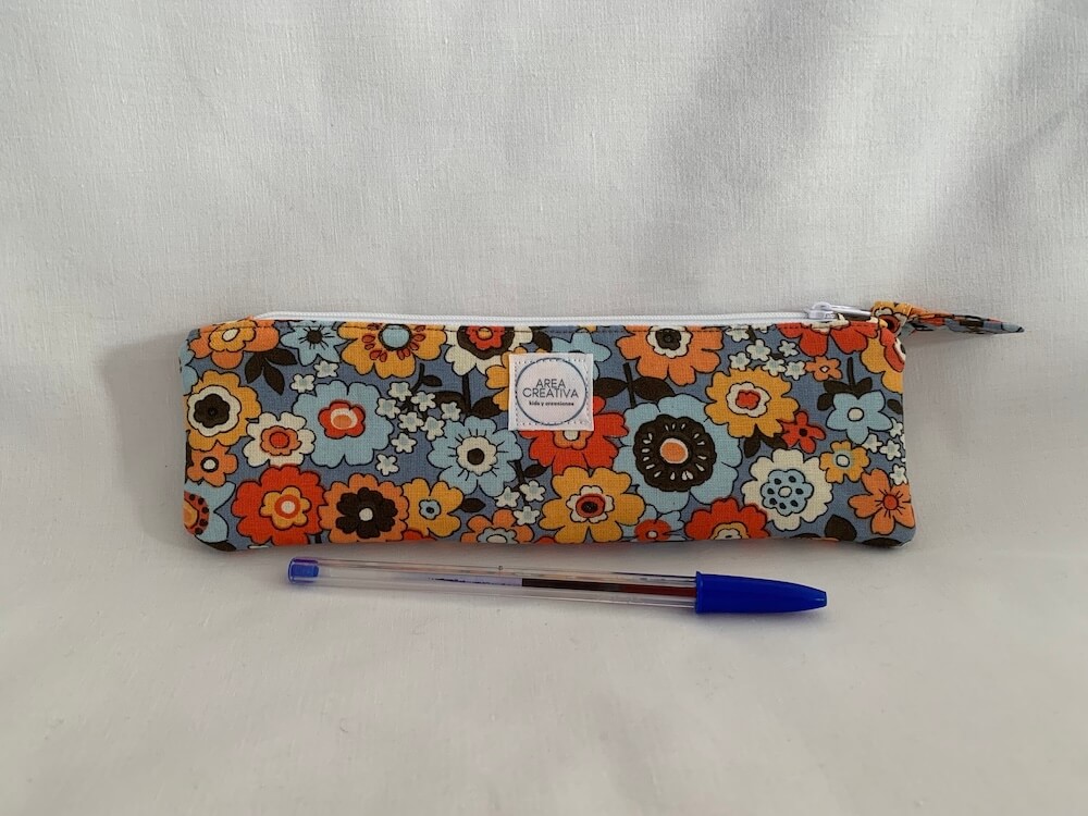 Esta pieza es perfecta para guardar lápiz y bolígrafo. Mide unos 23 cm de ancho y unos 8 cm de alto. Cierra con una cremallera superior que permite cerrar totalmente.