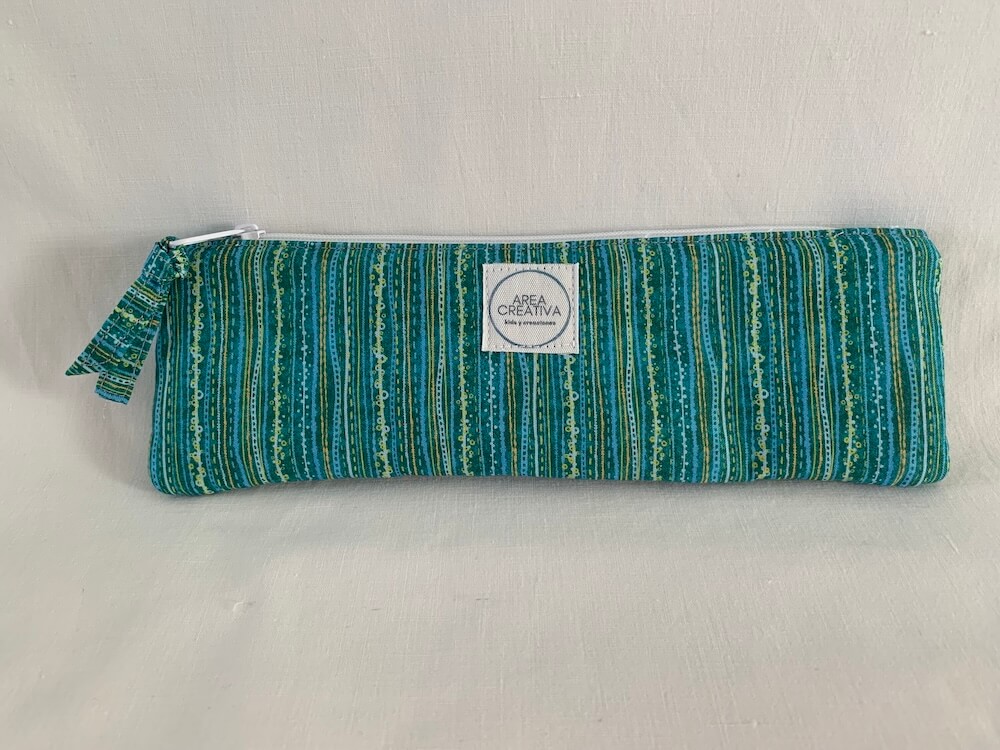 Esta pieza es perfecta para guardar lápiz y bolígrafo. Mide unos 23 cm de ancho y unos 8 cm de alto. Cierra con una cremallera superior que permite cerrar totalmente.