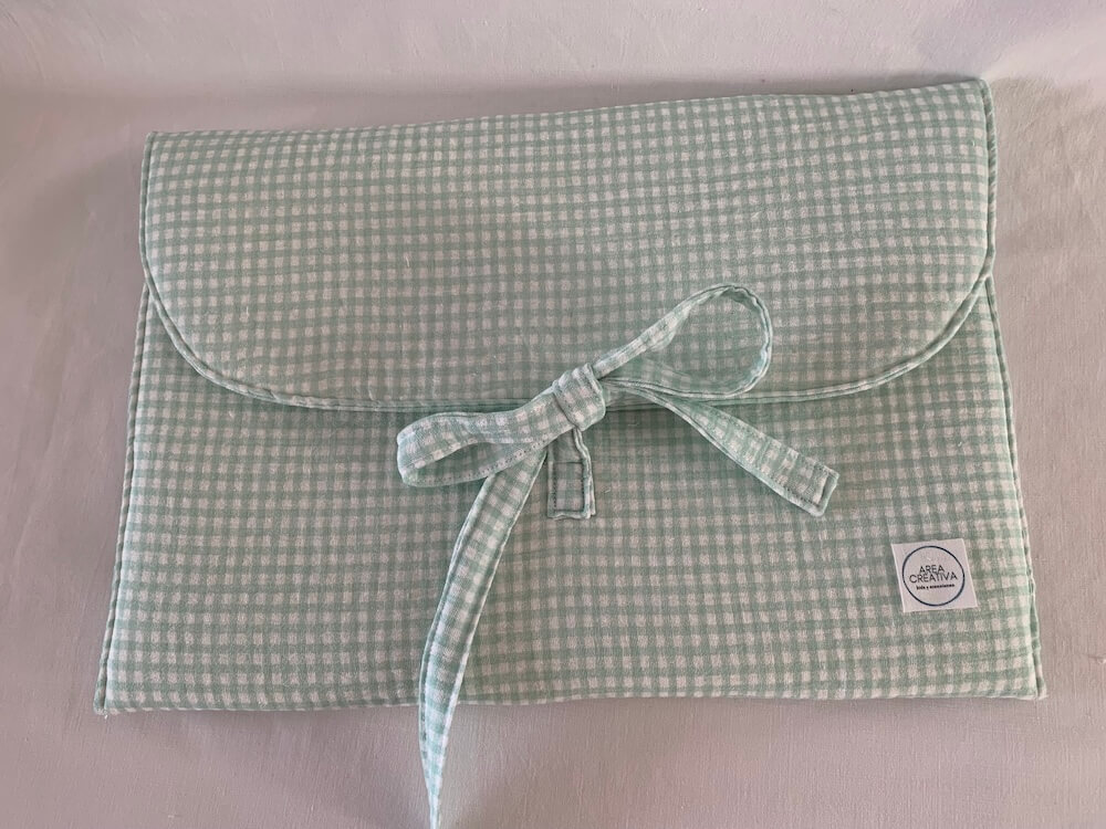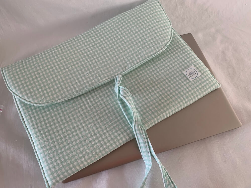 Funda para ordenador con solapa y lazo en tejido cuadro vichy verde